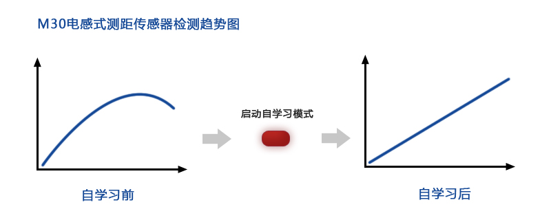 通過一個簡單的頗具創新性的單點自學習過程,只要按下按鈕,用戶就可以快速、方便地對傳感器進行設置或調節,以滿足特殊應用的要求。此傳感器只需在某一個特定位置進行自學習。自學習觸發點的輸出信號為線性信號,且斜率滿足所需要求。這意味著傳感器還可以安裝在由于應用的測量范圍動態變化而無法在第二個點進行自學習的任何場合,例如軸變形的測量。由于安裝誤差直接在傳感器中就被消除了,因此可保證重復測量并降低安裝成本。